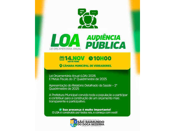 A Prefeitura Municipal de São Raimundo do Doca Bezerra convida toda a população para participar de uma Audiência Públ [...]